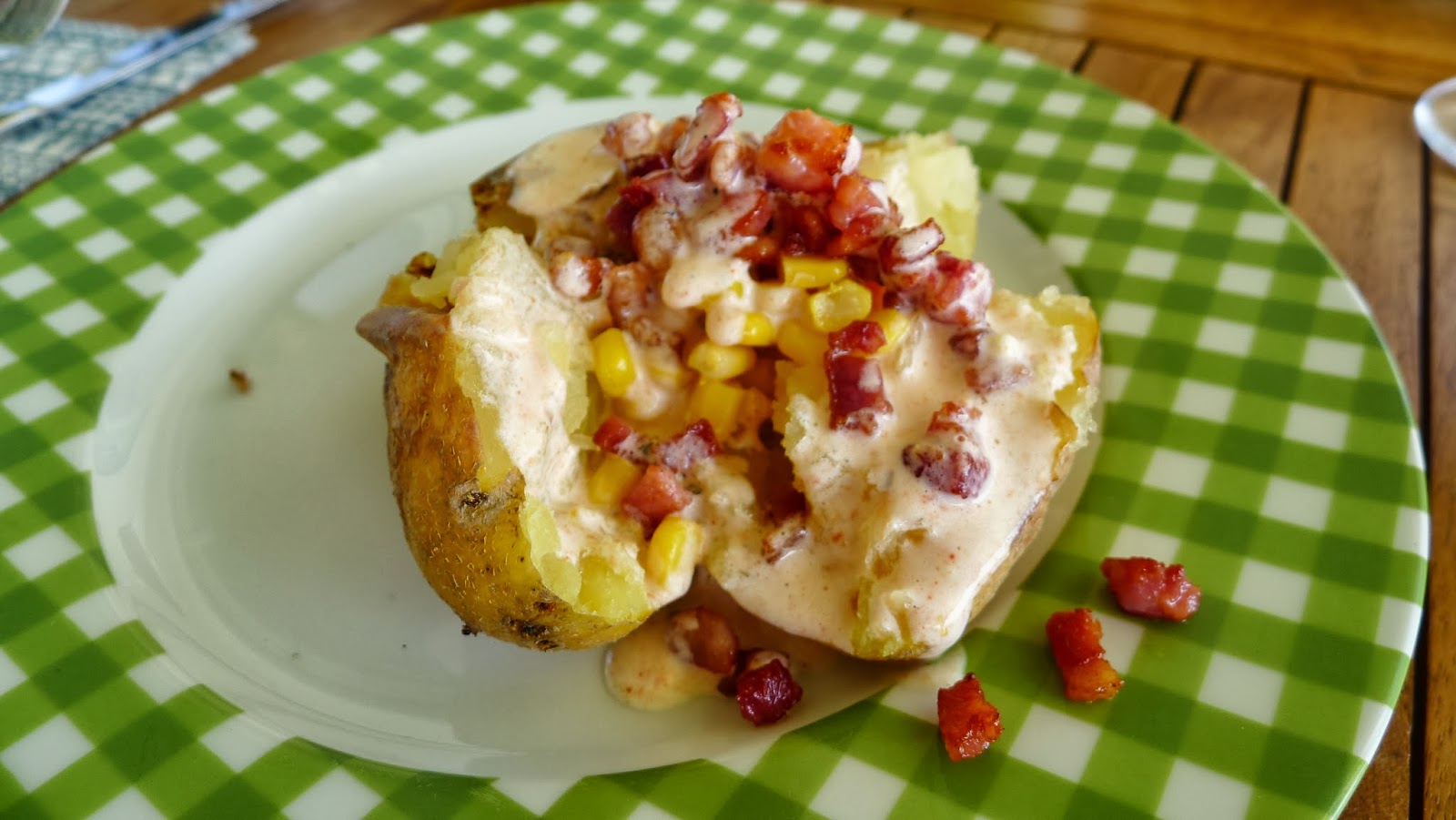 Server poteten sammen med bacon, mais og hjemmelaget thousand island
